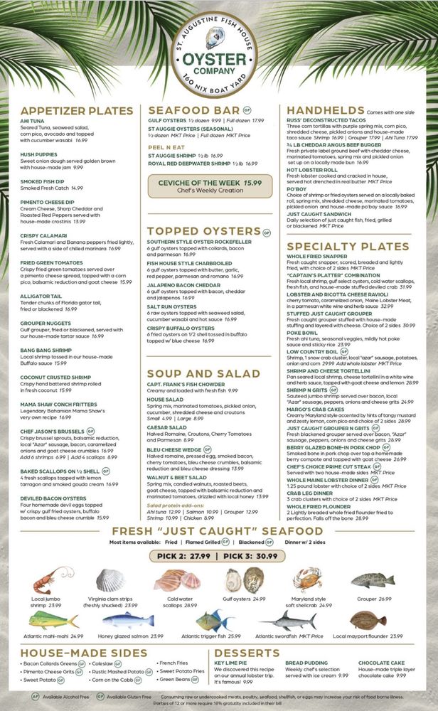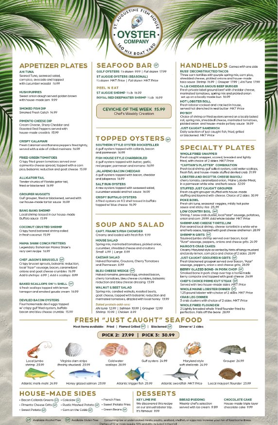 St Augustine Fish House & Oyster Company is a seafood oasis in the heart of St. Augustine. The warm, welcoming atmosphere and fresh seafood offerings make it a must-visit for seafood lovers. The menu is a treasure trove of coastal delights, with oysters, fish dips, and gourmet dishes that will leave you craving for more. The restaurant offers a unique blend of casual and classy dining, perfect for any occasion. With options for brunch, dinner, and happy hour specials, there's something for everyone to enjoy. The outdoor seating overlooking the water adds to the charm of this restaurant. Whether you're in the mood for classic seafood dishes or innovative creations, St Augustine Fish House & Oyster Company delivers an unforgettable dining experience. Don't miss out on trying the blackened Triggerfish and the southern-style oyster Rockefeller, and make sure to save room for the mouth-watering key lime pie dessert. A true Florida gem with great food, staff, and atmosphere!